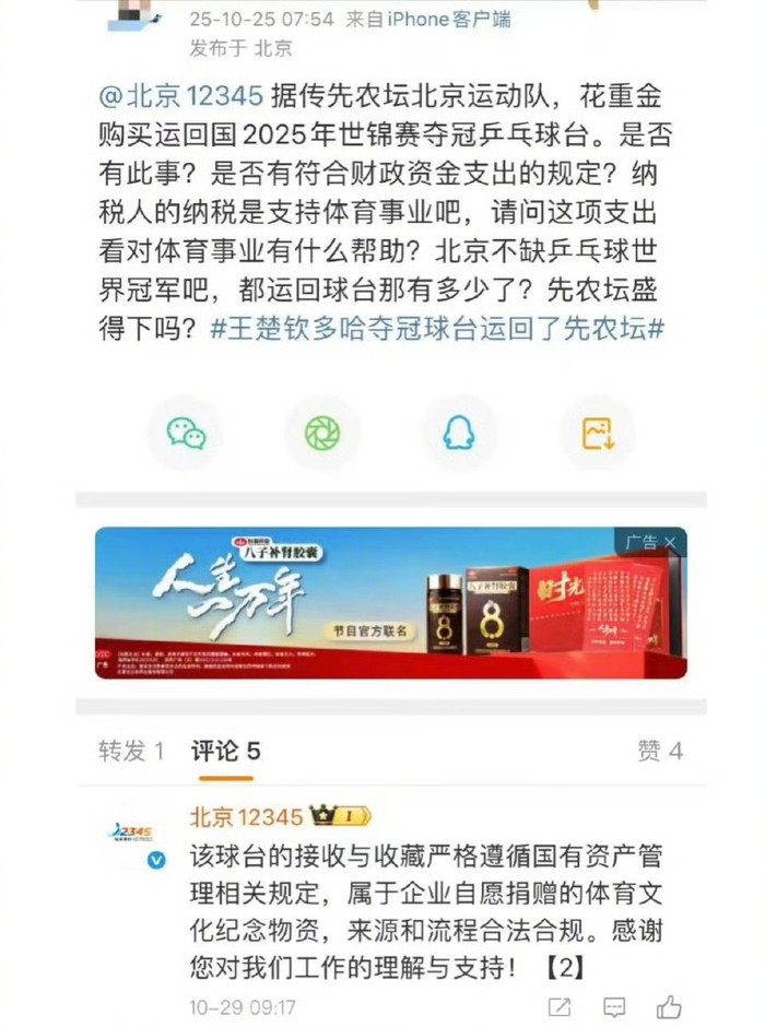 [#王楚钦夺冠球台为体育文化纪念物资#]#北京12345回应王楚钦夺冠球台争议##王楚钦夺冠球台系捐赠流程合规#10月31日,此前2025年多哈世乒赛夺冠球台被运回北京先农坛体校一事引发舆论关注,针对“球台由北京队重金购置”的说法,北京12345作出官方回应,明确该球台为企业无偿捐赠的体育文化纪念物资,来源与接收流程均合法合规。