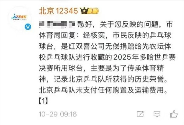此前,有消息称该球台由北京队花费超7万元人民币从多哈空运回国,引发网友关于资金使用合规性的质疑。对此,北京12345在回应中明确表示,球台为红双喜公司自愿捐赠,先农坛体校未支付任何购置及运输费用,接收与收藏过程严格遵循国有资产管理相关规定。